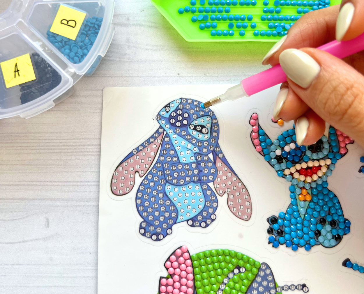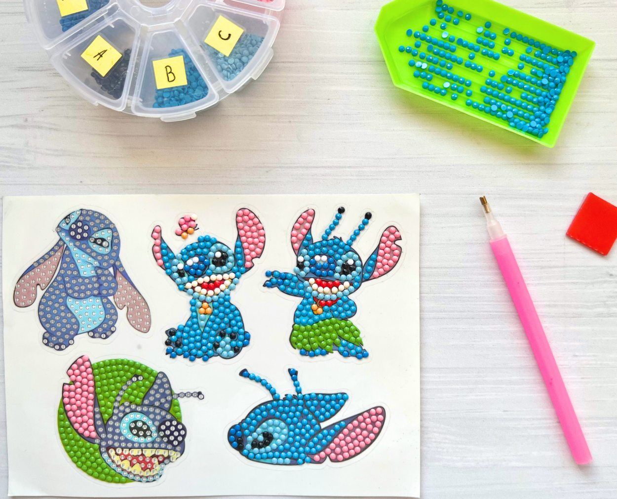 Todos los stickers de la imagen, diamantes suficientes, bandeja, lápiz aplicador, cera e instrucciones.